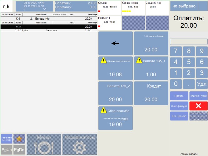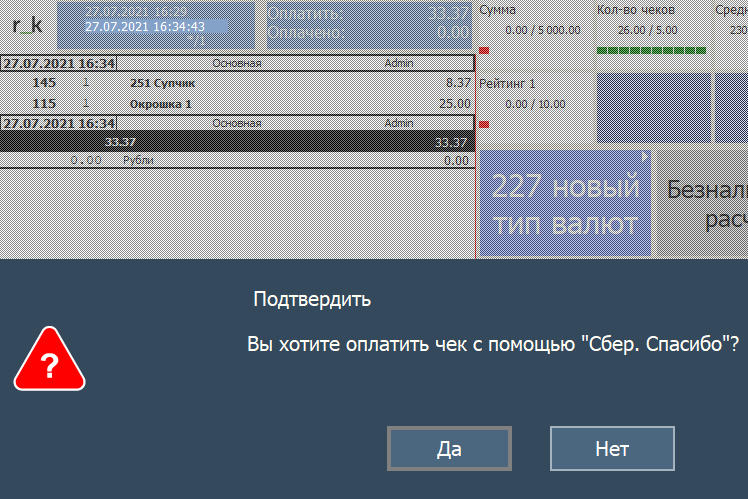 - В скрипте на кнопке "For Spasibo" добавьте перед последним "end;" строку RK7.PerformRefObject(RK7.FindItemByCode(rkrefCurrencyTypes, <GroupCode> ));