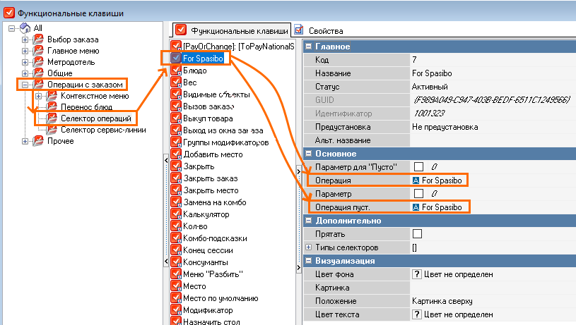 Для этого перейдите в меню Настройки > Графический интерфейс > Функциональные клавиши > Операции с заказом > Селектор операций > Вкладка Функциональные клавиши > нажмите в свободном поле правой кнопкой мыши > Новая функциональная клавиша - Назначьте ей созданную ранее операцию