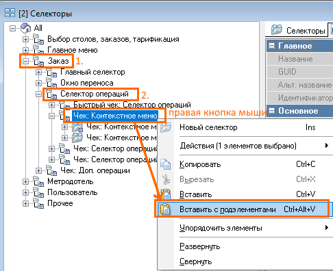 - Создайте копию предустановленного селектора Чек: Контекстное меню, выберите вставить с подэлементами в селектор Чек: Контекстное меню. Переименуйте копию.