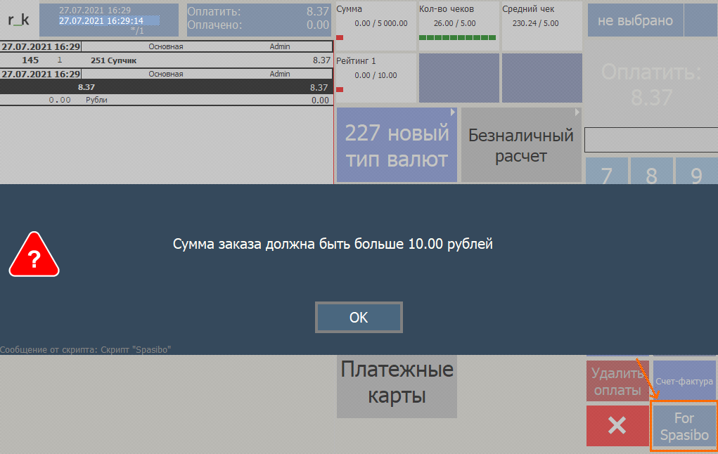 - Стоимость заказа меньше значения minprice := 10, — будет получено информационное сообщение о том, что использование оплаты балами системы лояльности Спасибо невозможно, так как сумма меньше минимально разрешенной, в нашем случае это 10 рублей