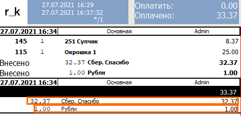 - Остаток доплаты — в нашем случае 1 рубль, регулируется параметром MinPayOtherLimit=100 в extspasibo.ini.