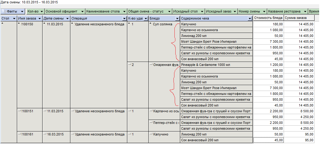 Задача: Необходимо добавить в куб Операции поле Содержимое заказа. При создании нового куба столбцы стали некорректно отображают информацию: если в одном чеке несколько удаленных блюд, колонка содержимое чека повторяет информацию.