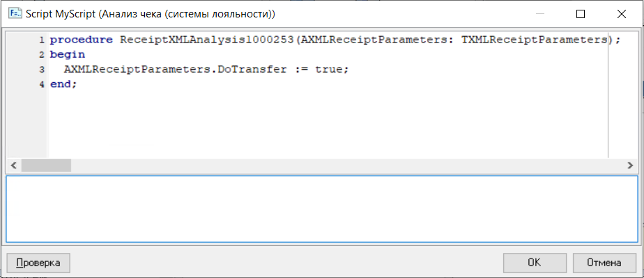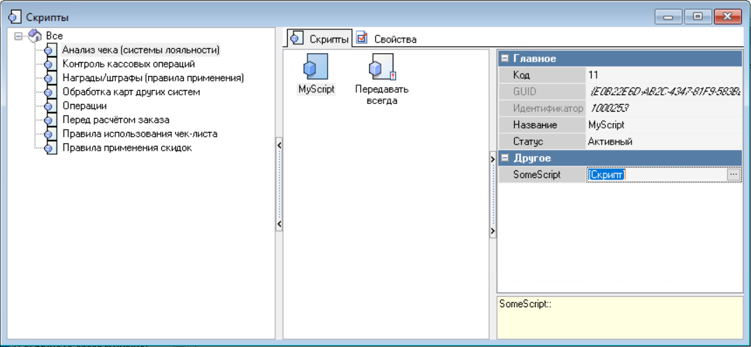 Скрипты могут быть нескольких предустановленных типов: «Контроль кассовых операций», "Награды/Штрафы", "Обработка карт других систем", "Операции" и "Правила применения скидок".
