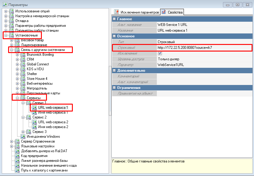 В менеджерской части, в словаре «Параметры», нужно выбрать группу «Сервисы». В подгруппе «Сервис1» в параметре «URLweb-сервиса1»необходимо прописать в параметре «Основное» пункт «Строковый» - apiserver (на котором установлена программа EgaisForPos), и порт frontend который указан в конфигураторе EgaisForPosConf.exe (см. Рис. 1).