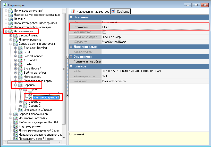В менеджерской части, параметр «Имя web-сервиса1» необходимо прописать в параметре «Основное» пункт «Строковый» - ЕГАИС (именно так будет называться кнопка на кассовой станции) (см. Рис. 2).
