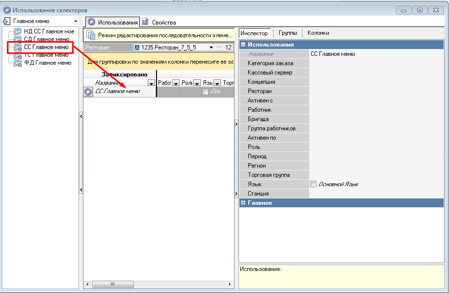 В менеджерской части, в словаре «Использование селекторов», в режим редактирования элементов необходимо назначить использование селектора «СС Главное меню» (см. Рис. 3).