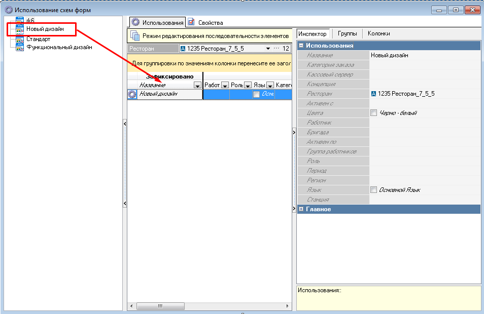 В менеджерской части, в словаре «Использование схем форм», в режим редактирования последовательности элементов необходимо назначить в использование форму «Новый дизайн» (см. Рис. 4).