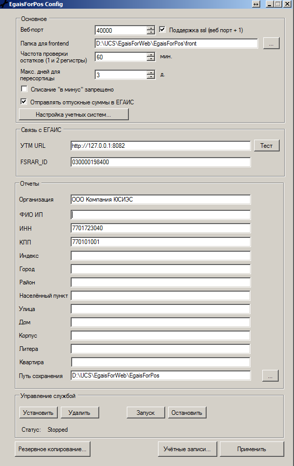 Резервное копирование – данная настройка включает резервное копирование файла базы данных EgaisForPos. Для включения настройки нажмите на кнопку