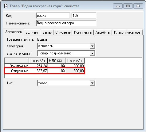 В основном приложении SH.exe на карточке товаров, сопоставленных с товарами ЕГАИС, необходимо заполнить Отпускную цену на закладке «Заголовок» (см. Рис. 13). Использоваться будет цена, включая налоги.