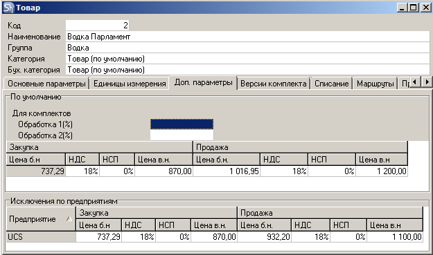 На закладке «Доп. параметры» карточки товара StoreHouse укажите отпускную цену за «базовую» единицу измерения товара (см. Рис. 13).