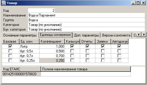 Цена выставляется за базовую единицу измерения товара. Если сопоставление товара ЕГАИС с товаром SH произведено с НЕ базовой единицей измерения, то отпускная цена будет пересчитана по коэффициенту сопоставленной единицы измерения к базовой единице измерения.
