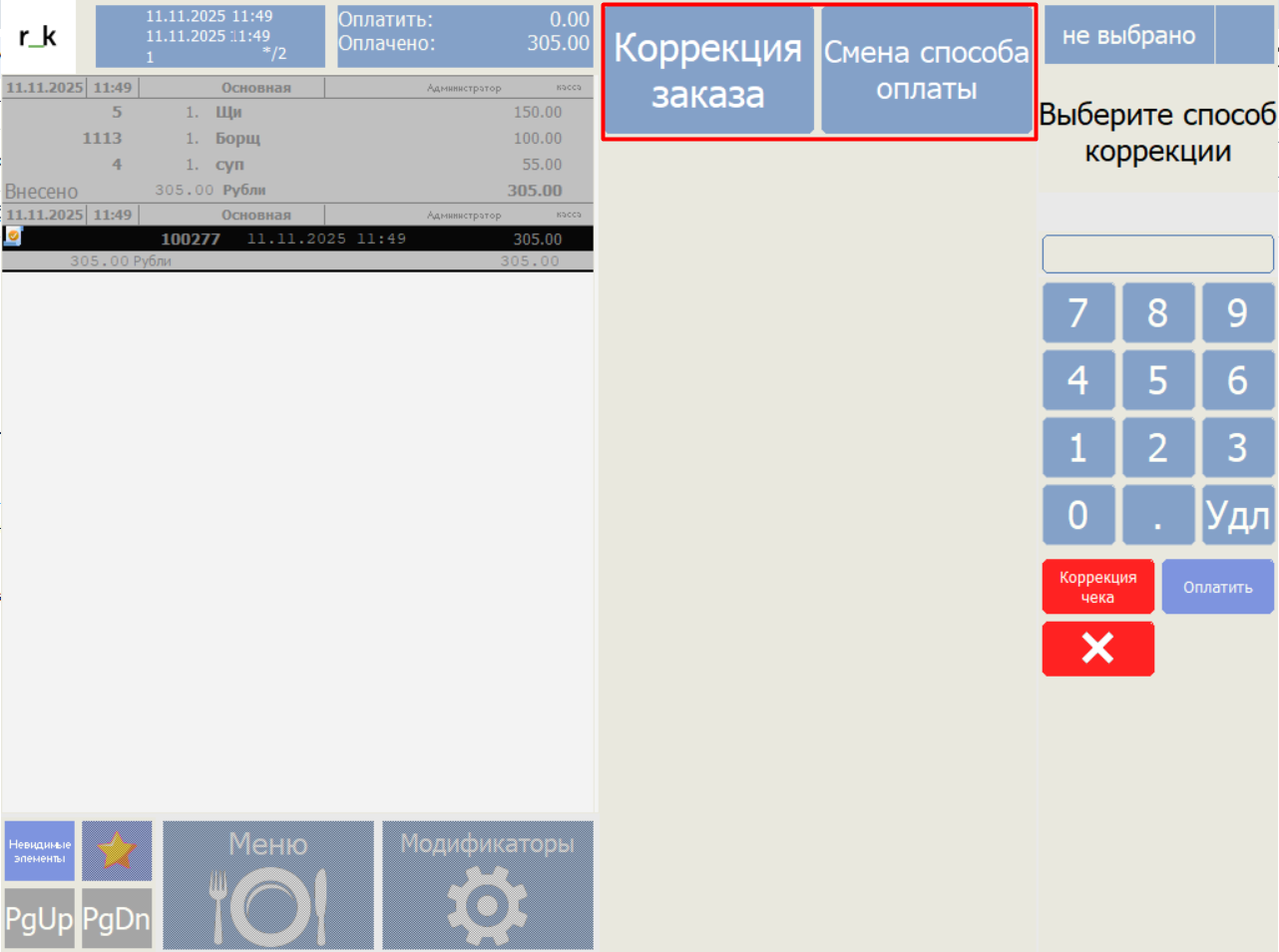 - Коррекция заказа - при нажатии, отменяется пречек и можно внести изменения в заказ (удалить/добавить блюдо/скидку/наценку, так же сменить вариант оплаты);