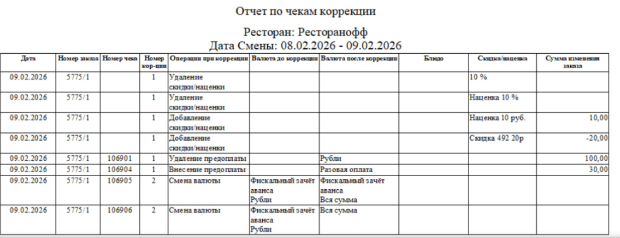 Отчет по чекам коррекции: добавили вывод информации о добавлении/удалении скидок/наценок и об изменении способа оплаты