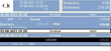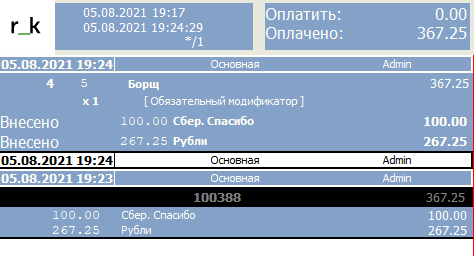 procedureReceiptXMLAnalysis1001330(AXMLReceiptParameters: TXMLReceiptParameters);varp:integer;xml, PaymentTag, ExtInfo, CardInfo:string;beginxml := AXMLReceiptParameters.ReceiptXML;whilexml <>''dobeginp := pos('<PAYMENT ', xml);ifp =0thenexit;xml := copy(xml, p, length(xml));p := pos('/>', xml);PaymentTag := copy(xml,1, p +1);xml := copy(xml, p +2, length(xml));p := pos('exttransactioninfo="BANK:SBRF', PaymentTag);ifp >0thenbeginExtInfo := copy(PaymentTag, p + length('exttransactioninfo="'),length(PaymentTag));p := pos('"', ExtInfo);ExtInfo := copy(ExtInfo,1, p -1);p := pos('/PdsCard=', ExtInfo);ifp =0thenbeginp := pos('PdsCard=', ExtInfo);ifp =1thenCardInfo := copy(ExtInfo,1+ length('PdsCard='), length(ExtInfo))elseCardInfo :='';endelseCardInfo := copy(ExtInfo, p + length('/PdsCard='), length(ExtInfo));ifCardInfo <>''thenbeginp := pos(CardInfo,'/');ifp >0thenCardInfo := copy(CardInfo,1, p -1);AXMLReceiptParameters.CardCode := CardInfo;AXMLReceiptParameters.DoTransfer :=true;AXMLReceiptParameters.SilentMode :=true;end;end;end;end;- Назначьте скрипт интерфейсу SBRF_Spasibo созданному ранее