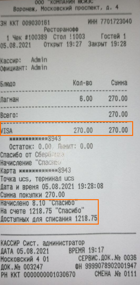 - После настроек печати чека вы увидите начисление баллов Спасибо, при печати