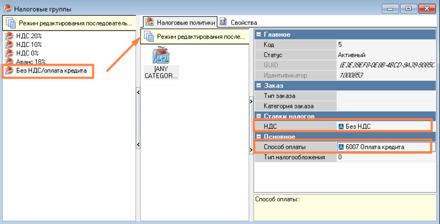 В справочнике Деньги > Налоговые группы создайте налоговую группу Без НДС/оплата кредита. В Налоговой политике в свойстве НДС выберите значение Без НДС и в свойстве Способ оплаты — Оплата кредита.
