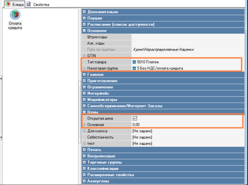 Для последующей оплаты кредита в справочнике Меню > Меню создайте блюдо Оплата кредита. И установите следующие значения для его свойств: