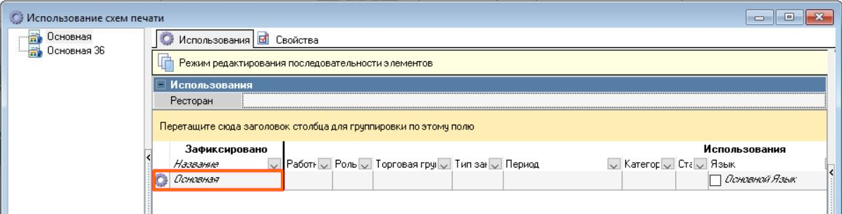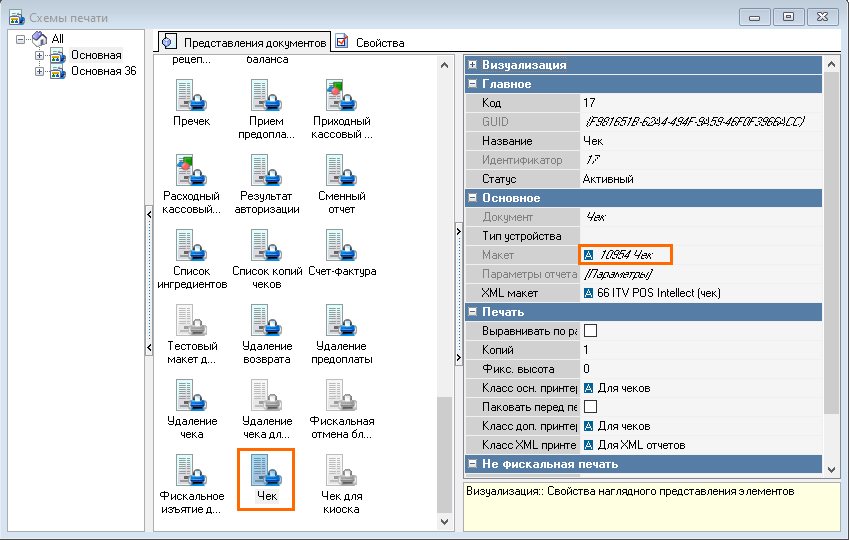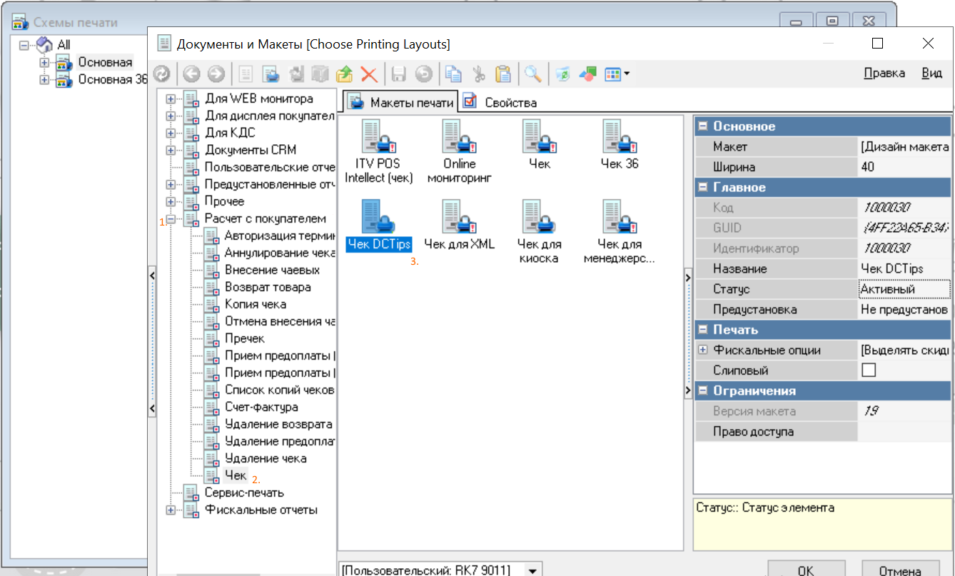 3. Выберете используемую схему печати, которую узнали в прошлом пункте. Найдите документ Чек, узнайте какой макет: номер и название сейчас используется по умолчанию.