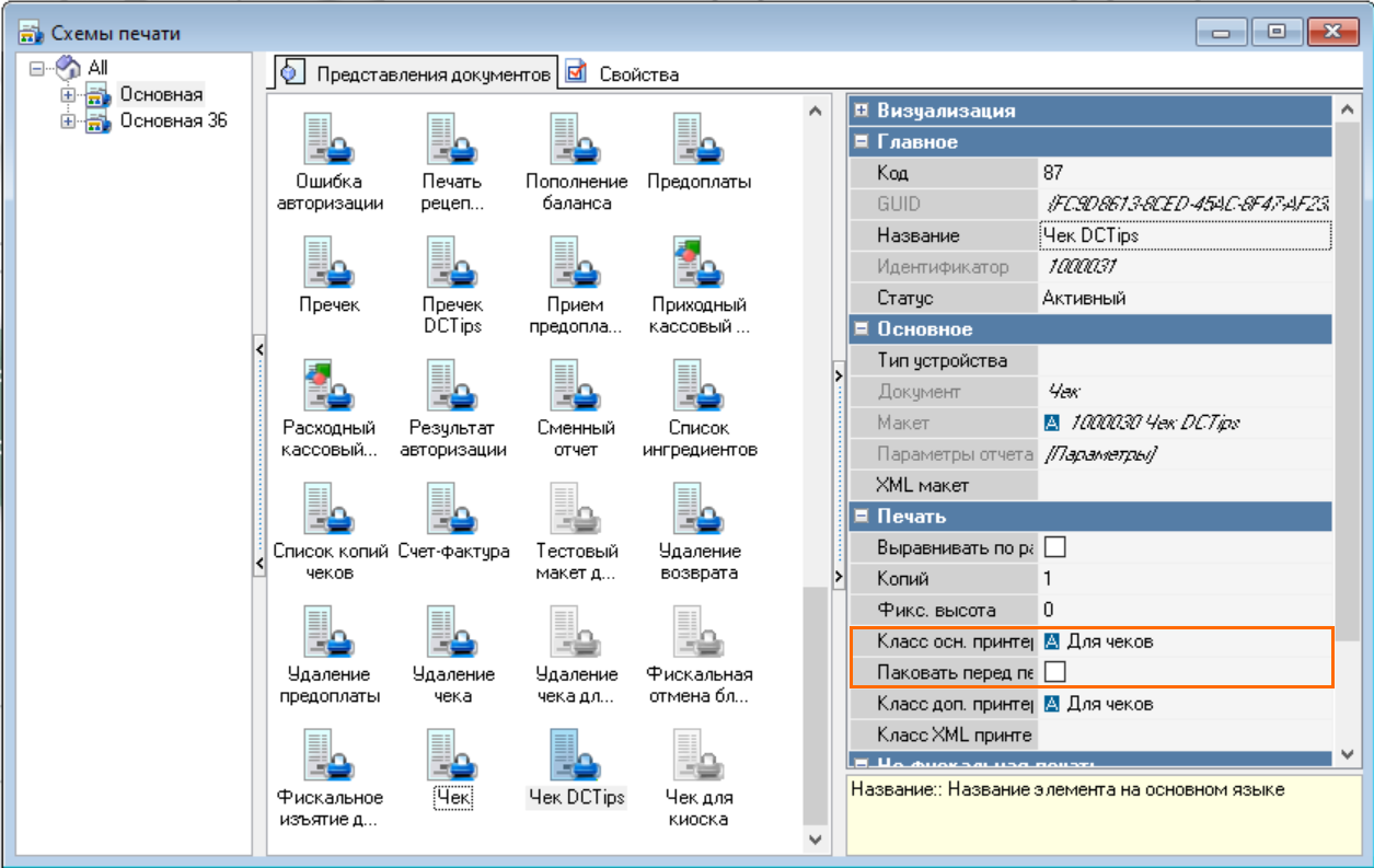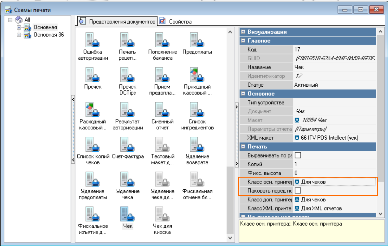 15. Снова откройте текущую схему печати, название которой вы посмотрели ранее в использование схем печати. Выберите текущий макет чека, посмотрите какой Класс осн. принтера выбран, стоит ли галочка Паковать перед печатью, запомните это.