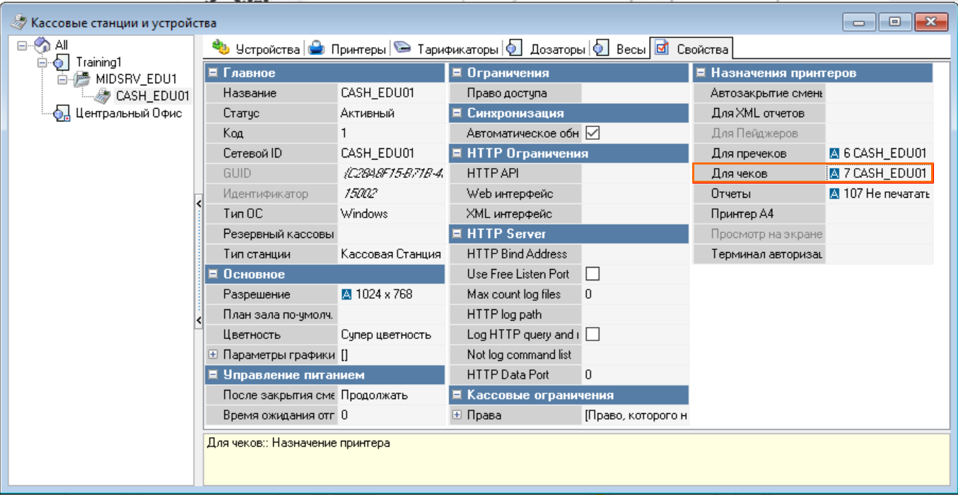 22. Для этого выберете станцию, на  вкладке Свойства, в разделе Назначения принтеров узнайте какой принтер используется: Для чеков, или другого класса, если в схеме печати как Класс осн. принтера указан иной класс