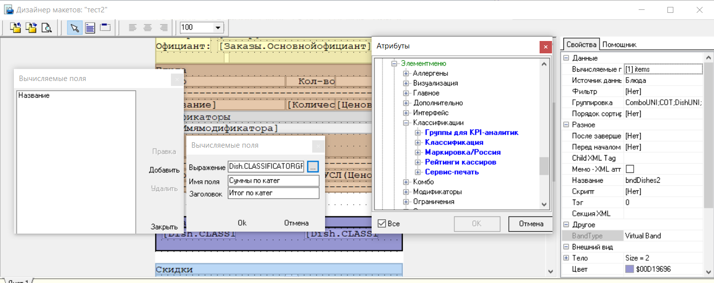 3. Выделите нужный Бенд. Выберите пункт Вычисляемые поля. Добавьте Вычисляемое поле из Представленного списка Атрибутов (Элемент меню > Классификации). Имя Поля и Заголовок заполняется вручную в окне Вычисляемые поля.