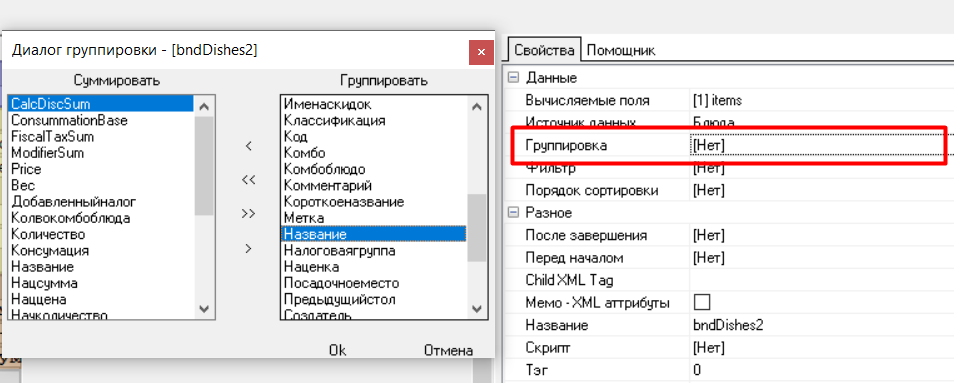 4. С помощью поля Группировка, в свойствах выделенного Бенда, открыть окно Диалог группировки и вынести в правый список нужную классификацию (созданное в предыдущем шаге вычисляемое поле, найдя его по раннее указанному заголовку). Если окно группировки содержит другие данные, то перенести их в левый список.