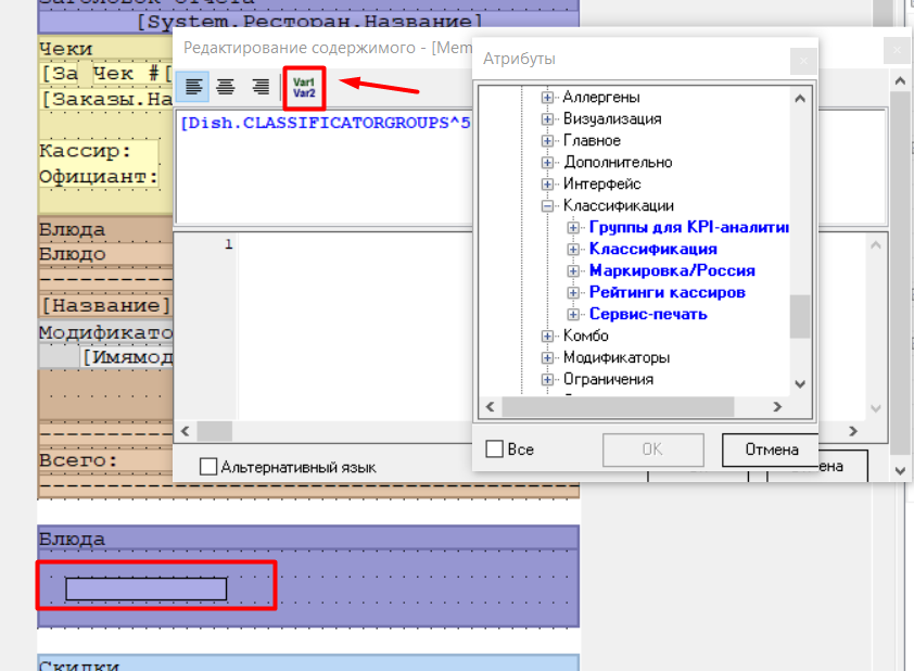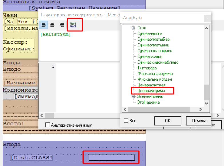 6. Добавить в Бэнд еще одно Мемо и вывести в нем переменную [ЦеноваяСумма] (в этом случае суммы будут указываться без учета скидки). Если суммы по категориям нужно указывать с учетом скидки, то в поле Редактирование содержимого должна быть формула [Ценовая Сумма+СуммаСкидки]