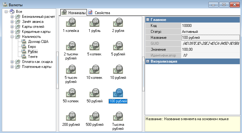 - Название — задайте название, отражающее суть номинала. Например, 100 рублей