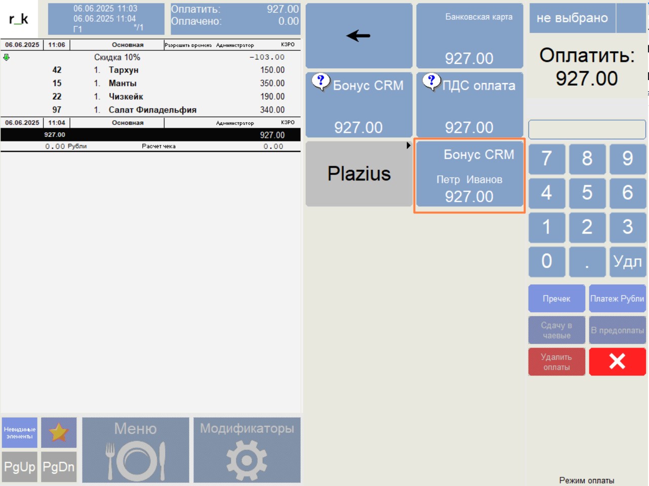 В режиме Карта на входе можно использовать персональные дисконтные карты — ПДС или CRM. При регистрации карты в визите нужно пополнить счет карты, в таком случае средства попадают на дебетовый счет.