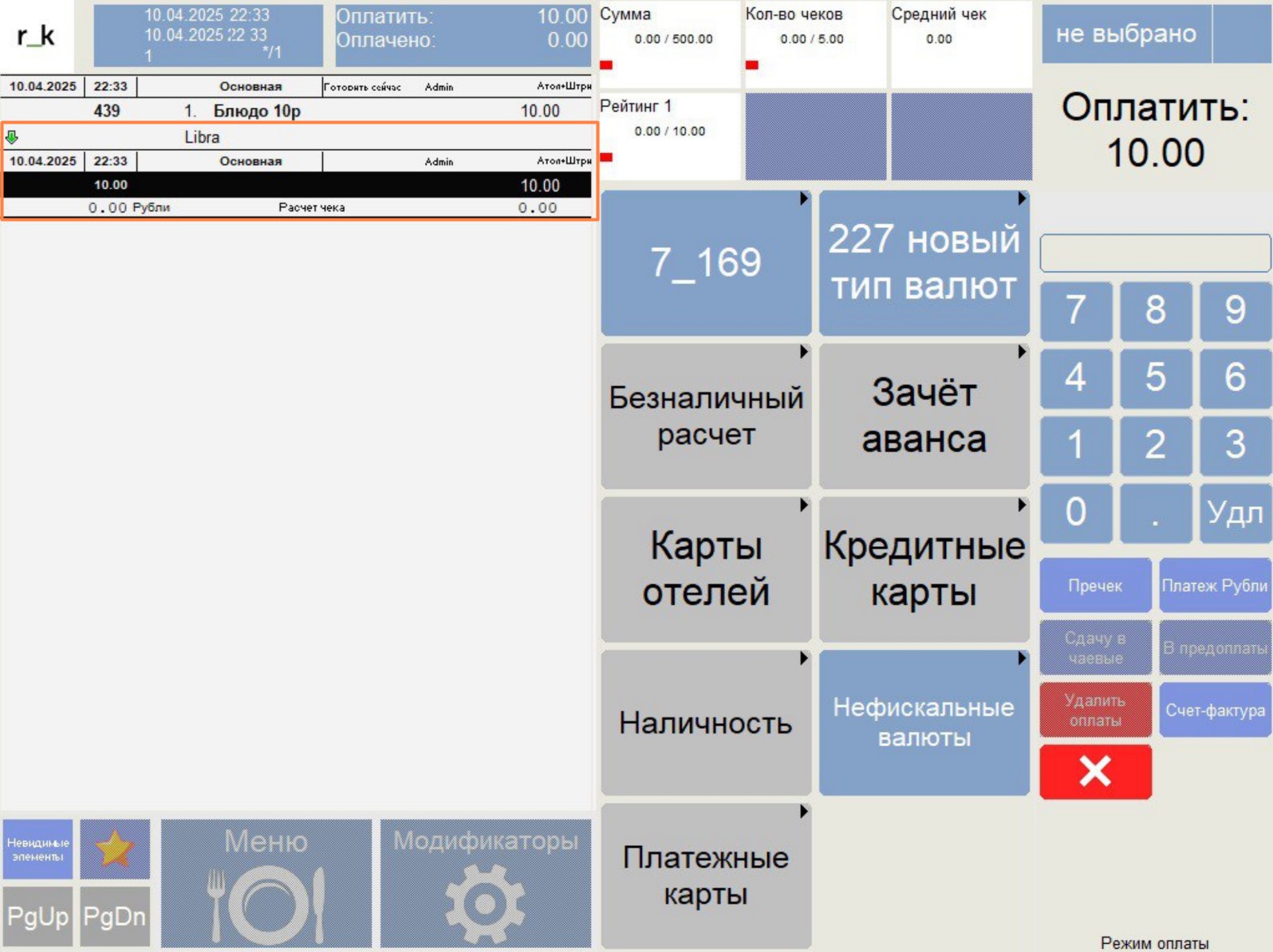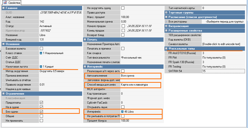SendFiscalData - отправлять ли марки (ЧЗ) в Logus HMS.DefDiscountCode - код нулевой скидки r_k ( заранее создайте скидку, с нулевой детализацией).Если при закрытии чека на номер в r_keeper печатается фискальный чек с признаком «передача в кредит» — необходимо отключить передачу маркировки "SendFiscalData": false, иначе будет ошибка на стороне Logus HMS. - Создайте валюту с настройками: