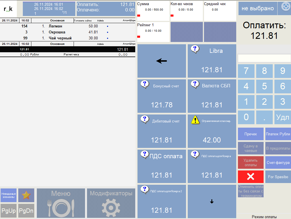 - Нажмите кнопку Оплата картой, и стол закроется. Данные передадутся в гостиничную систему.