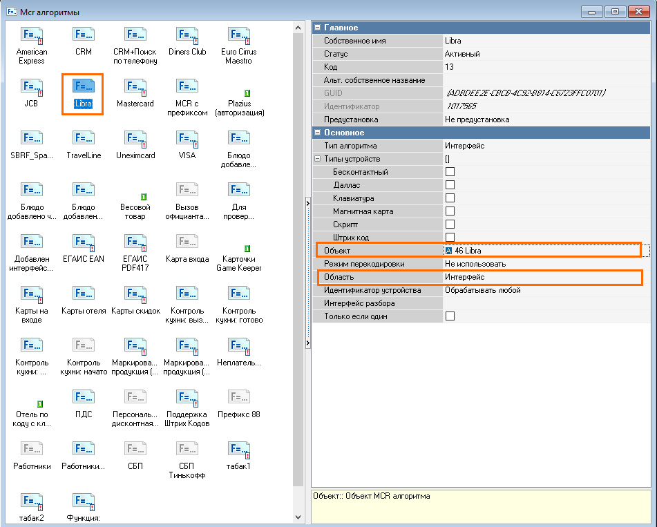 - Добавьте MCR алгоритм. В свойствах в блоке Основное укажите тип Интерфейс. В поле Объект укажите интерфейс Logus HMS