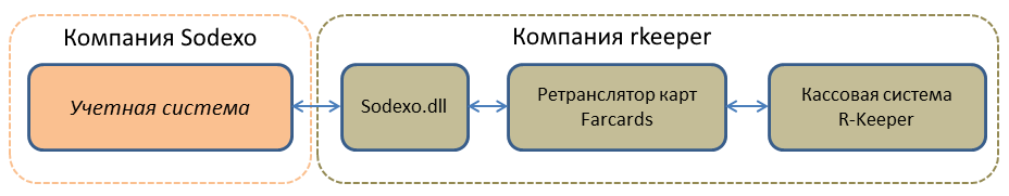 Взаимодействие R-Keeper с учетной системой Sodexo осуществляется посредством ретранслятора карт Farcards и специальной интерфейсной библиотеки Sodexo.dll:
