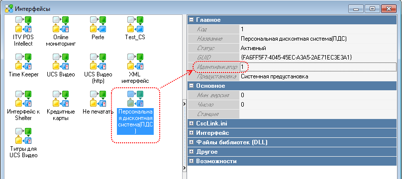 - в справочнике Сервис ⇒ Интерфейсы выбрать интерфейс [Персональная дисконтная система(ПДС)] и проверить значение параметра Идентификатор - такое же значение должно быть указано в параметре PDSIdent конфигурационного файла Sodexo.ini: