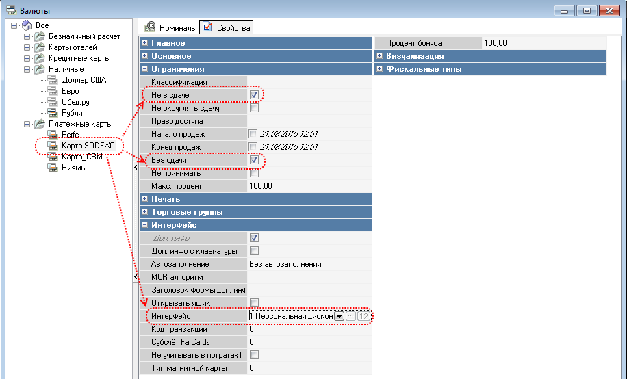 - в справочнике Деньги ⇒ Валюты создать новую валюту, например "Карта SODEXO", и установить параметры "Не в сдаче", "Без сдачи" и "Интерфейс":