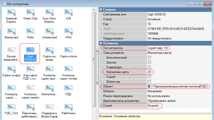 В случае создания в справочнике Сервис ⇒ Интерфейсы отдельного ПДС-интерфейса для связи с учетной системой Sodexo, необходимо указать этот интерфейс в свойствах валюты (параметр "Интерфейс")- в справочнике Сервис ⇒ Обработка сигналов устройств ⇒ MCR алгоритмы создать новый MCR-алгоритм на базе предустановленного алгоритма [Персональные дебетовые (ПДС)]