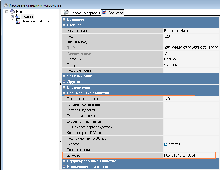 Перезагрузите менеджерскую станцию. - В свойствах кассы, кассового сервера или ресторана — в зависимости от того, для какого из объектов создавалось расширенное свойство, заполните его ссылкой (адресом) на требуемый сервис EgaisForPos, например http://127.0.0.1:8084.