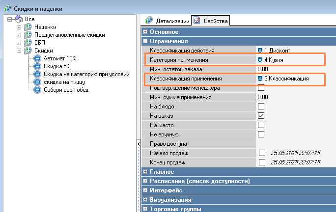 - В свойствах созданной скидки в группе Ограничения заполните свойства Классификация применения (классификация, в рамках которой нужно будет совершить потраты) и Категория применения (категория, в рамках которой нужно совершить потраты для того, чтобы применилась скидка на Категорию из детализации)