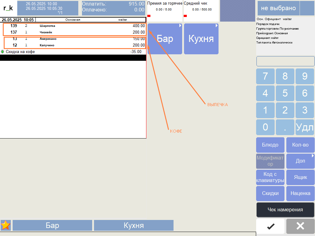 Готово. Если в заказе присутствуют блюда из категории Выпечка, то скидка на кофе будет рассчитываться.