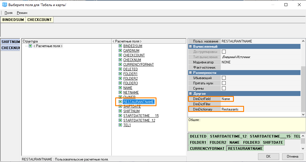 - Для поля куба RESTAURANTNAME укажите справочник Restaurants и поле для вывода значений Name