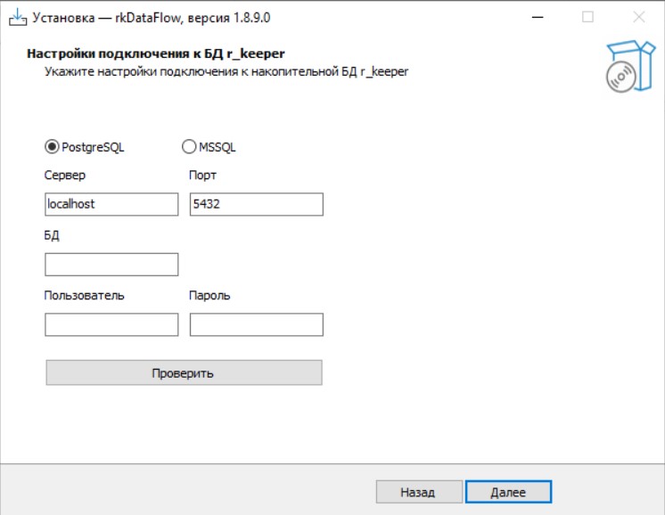 - Введите данные для подключения к PostgreSQL. Можно изменить название Базы Данных, если устанавливаются несколько экземпляров r_k DataFlow. Данная База Данных используется самим r_k DataFlow и не должна быть привязана к r_k 7