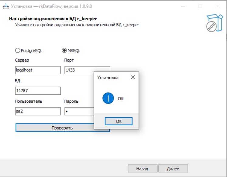 После введения, выполните проверку подключения. При успешной проверки, нажмите кнопку Далее