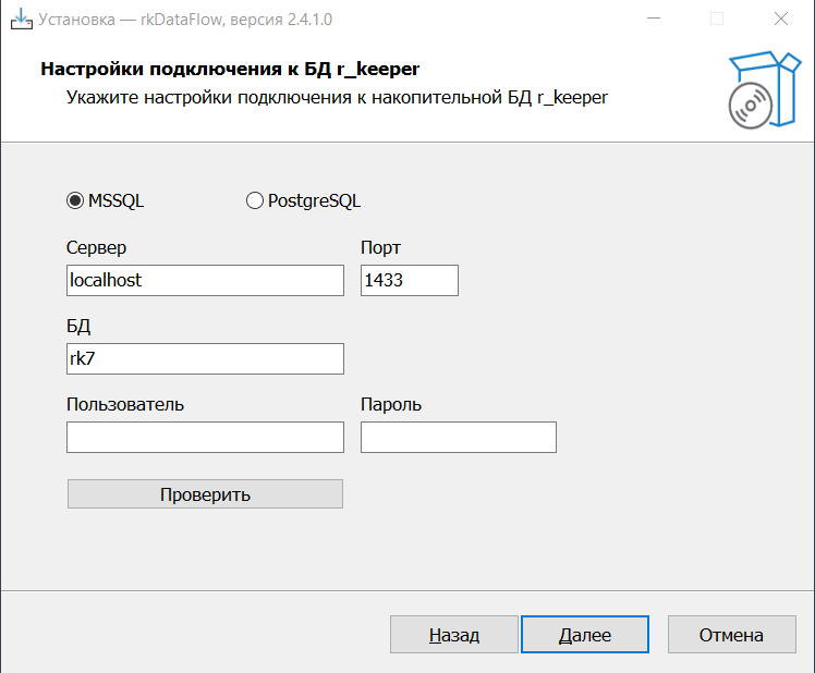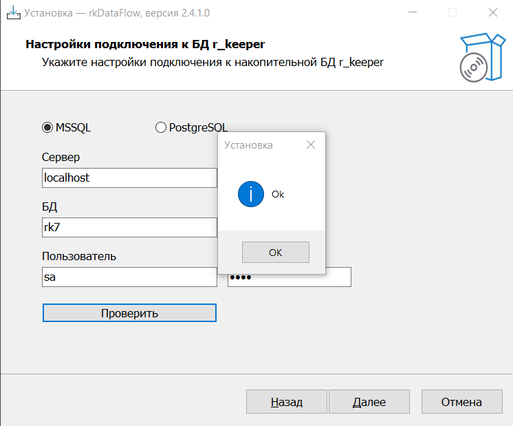 6. Введите данные для подключения к накопительной Базе Данных r_k 7. База Данных должна быть создана до выполнения данного действия. Так же должна быть произведена выгрузка в данную базу.
