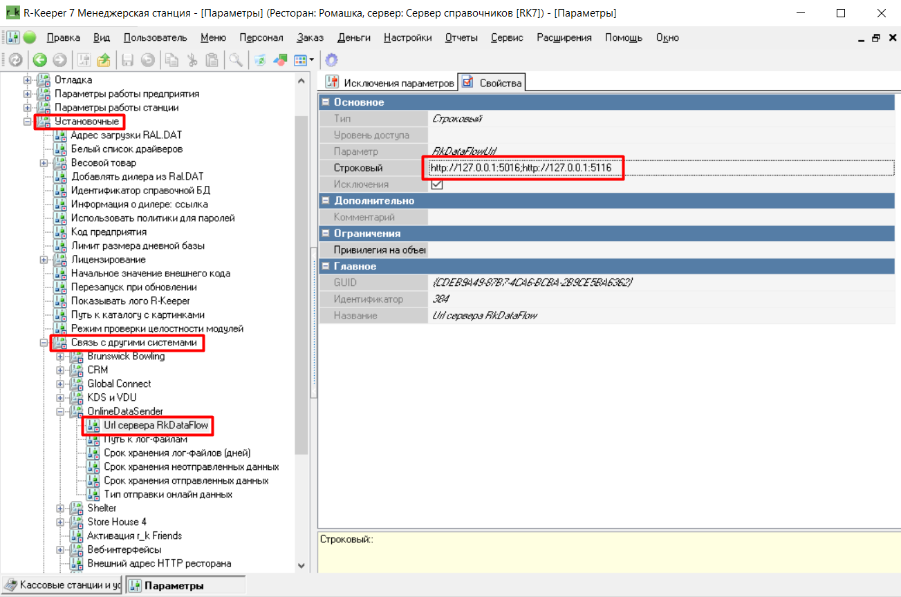 1. В справочнике Настройки>Параметры>Установочные>Связь с другими системами>Url сервера RkDataFlow. В свойстве Строковый укажите подключение к r_k DataFlow: http://127.0.0.1:5016. 5016 - порт, на котором запускается r_ k DataFlow по умолчанию, можно поменять (указывать можно несколько адресов через точку с запятой. Пример значения для параметра RkDataFlowUrl для отправки на 2 сервера dataFlow: "http://127.0.0.1:5016;http://127.0.0.1:5116")