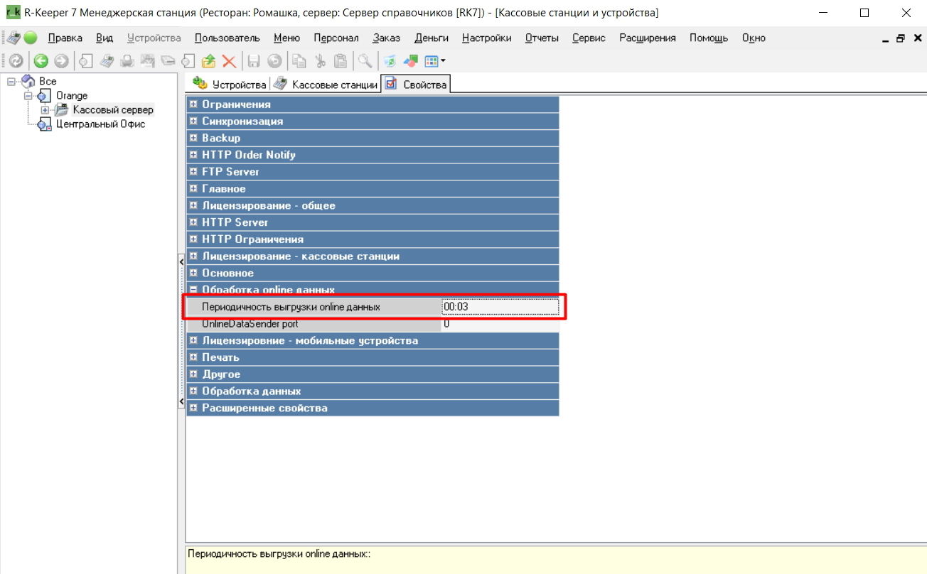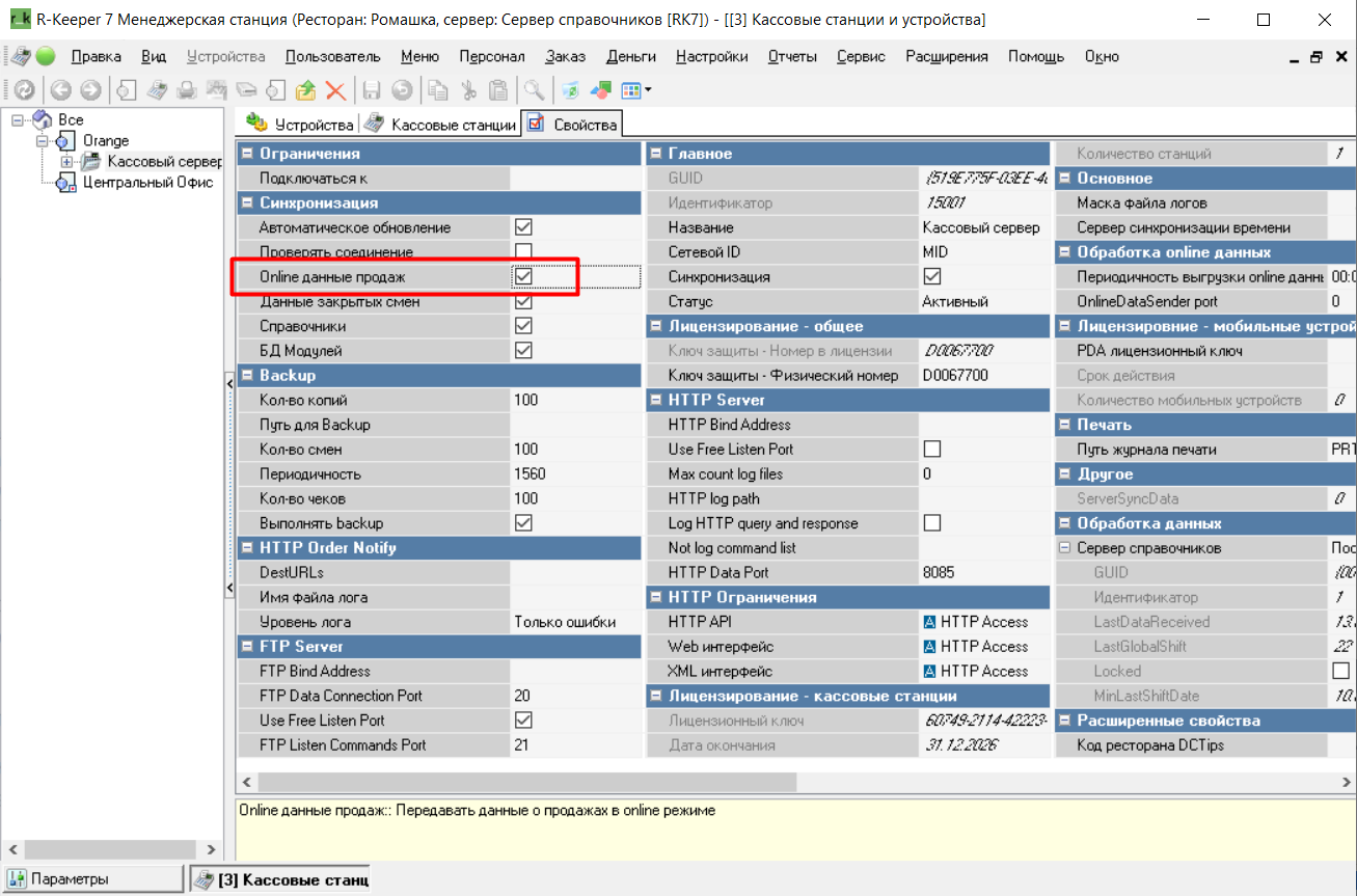 "Online данные продаж" находится в Станции и устройства > Кассовый сервер > Свойства > Синхронизация > строка "Online данные продаж".