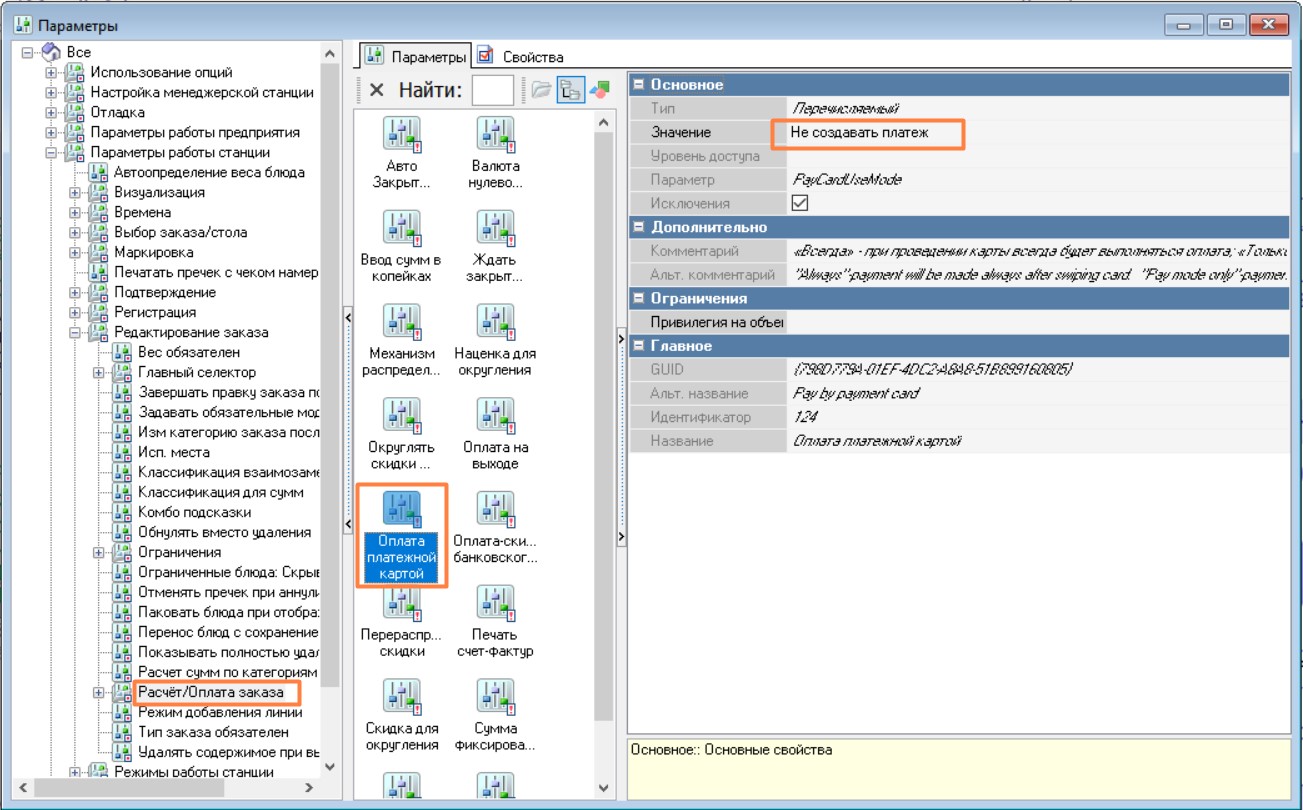 Установите параметр Оплата платежной картой в значение Только в режиме расчета