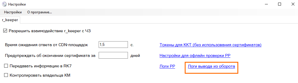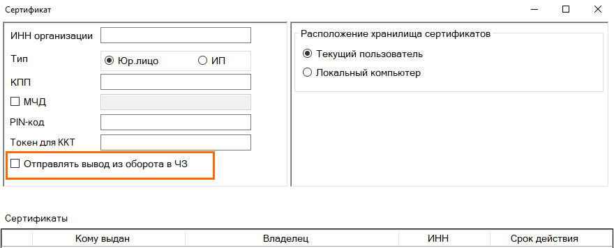 В rkDExchMan откройте нужный сертификат и в его настройках установите флаг Отправлять вывод из оборота в ЧЗ.
