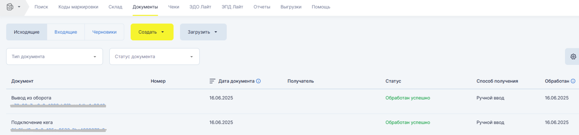 После ответа на запрос подключения кега в ЛК ЧЗ должно появиться 2 документа: Подключение кега и Вывод из оборота.