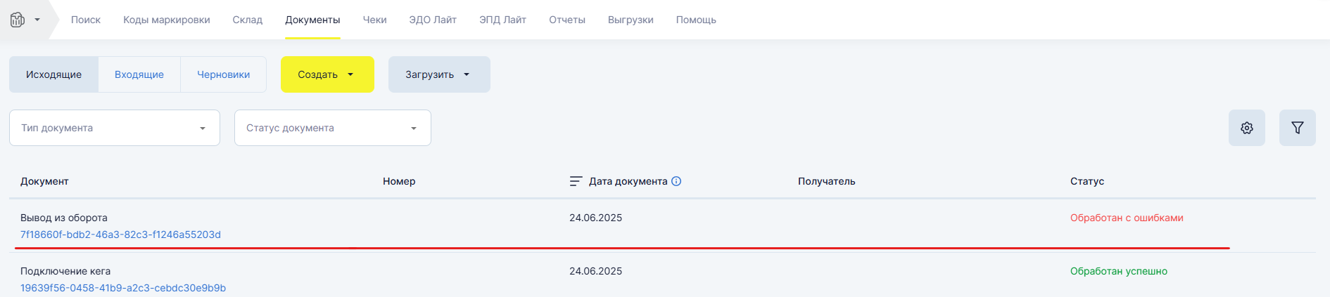 Если при постановке кега на кран произошла ошибка, то документ вывода из оборота по марке не сформируется.