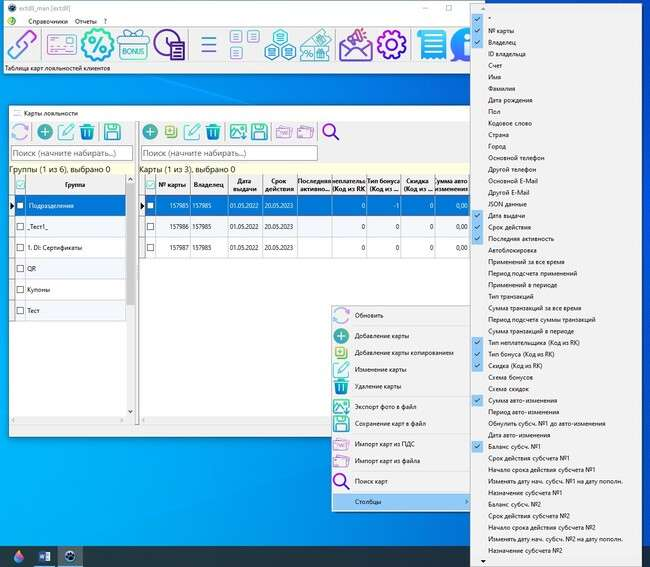 Интеграции с r_keeper Системы лояльности extdll_man Субсчета (кошельки) карт лояльности Current: Действия с картами, доступные в контекстном меню Действия с картами, доступные в контекстном меню Последнее изменение статьи 06.11.2025 17:52 Пункт меню «Столбцы» позволяет показать/скрыть в табличной форме доступные поля таблицы. ×